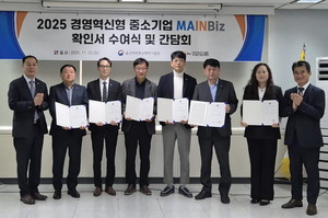 울산 지역 중소기업들의 경영혁신 성과를 공식적으로 인정하는 메인비즈 인증 수여식이 열리며 혁신 기반의 지속 성장 기업 육성에 힘이 실렸다. 울산지방중소벤처기업청(청장 노형석)과 한국경영혁신중소기업협회 부산·울산·경남 연합회(회장 김종호)는 25일 울산중기청 청사 중회의실에서 경영혁신형 중소기업(메인비즈 기업) 확인서 수여식을 개최했다고 밝혔다. 이날 행사에는 노형석 울산중기청장과 박종헌 연합회 수석부회장, 김상희 신용보증기금 울산지점장 등이 참석해 메인비즈 인증 기업들을 격려하고 앞으로의 성장 가능성을 응원했다. 메인비즈 기업은 업
