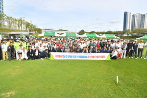제10회 울주군파크골프협회장배 친선파크골프대회가 22일 울산 울주군 청량파크골프장에서 열린 가운데 이순걸 울주군수와 최길영 의장 및 시군의원, 이용식 울주군체육회장 등 참가 선수단이 기념촬영을 하고 있다.