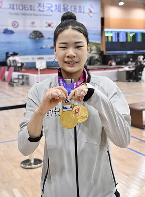 “자신 있게!” 매 시기 코치의 외침이 울려 퍼질 때마다 울산스포츠과학고 3학년 한주희는 숨을 고르고 바벨을 움켜쥐었다. 지난 17일 부산 남구 국민체육센터 2관. 제106회 전국체육대회 여고부 -59㎏급 무대에서 한주희가 인상·용상·합계 3관왕을 차지했다. 이날 한주희는 인상 84㎏, 용상 102㎏으로 합계 186㎏을 들어올리며, 지난해 용상·합계 2관왕에 이어 올해는 금메달 3개를 동시에 목에 걸었다. 경기장을 가득 채운 함성 속에서 그는 바벨을 높이 들었다가 내리며 고등부 마지막 전국체전을 금빛으로 마무리했다. 인상 첫 시기부