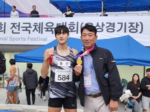 제106회 전국체육대회 남자일반부 멀리뛰기 결승이 열린 지난 19일 부산 아시아드주경기장. 7.91m의 기록으로 챔피언 자리에 오른 성진석(28·울산시청)은 시상대에서 내려와 금메달을 강재호 울산시청 육상팀 감독의 목에 직접 걸어주며 감사의 마음을 전했다. 이날 왼쪽 발목에 테이핑을 칭칭 감은 채 출전한 그는 경기 시작이 1시간가량 지연되고 차가운 바람이 부는 악조건 속에서도 흔들림이 없었다. 도움닫기 전 관중을 향해 박수를 유도하며 특유의 여유 있는 미소를 지었던 그는, 힘찬 도약으로 울산의 금빛 행진을 이어갔다. 성진석은 경기