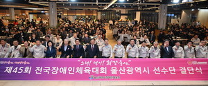 제45회 전국장애인체육대회 울산시 선수단 결단식이 23일 울산시티컨벤션 안다미로홀에서 개최됐다. 이날 행사에는 김두겸 울산시장, 김영길 중구청장, 최평환 동구 부구청장, 김철욱 울산시체육회장, 정진수 울산시장애인총연합회 회장, 김석만 울산시장애인체육회 부회장 및 장애인체육회 임원, 가맹경기단체장, 장애유형별 단체장 및 선수단 등 350여명이 참석했다. 결단식은 장애인총연합회에서 운영하는 소나무합창단의 사전공연, 후원금 전달, 경과보고, 단기 수여, 선수단 선서 등으로 진행됐다. 단기는 울산시장애인체육회장인 김두겸 시장이 최진구 총감