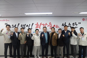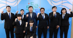 울산 동구 돌고래역도단이 27일 동구청장실에서 제45회 전국장애인체육대회 출정식을 갖고 김종훈 동구청장과 기념촬영을 하고 있다.