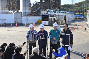 10일 한국동서발전 울산화력발전소 보일러 타워 붕괴 현장에서 열린 중앙사고수습본부 브리핑에서 오영민(왼쪽 두번째) 고용노동부 안전보건감독국장이 취재진 질문에 답하고 있다. 김도현기자 do@ksilbo.co.kr