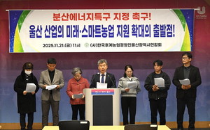 한국후계농업인경영회울산광역시연합회는 지난 21일 울산시청 프레스센터에서 기자회견을 열어 정부의 분산에너지 특구 지정 보류 철회 및 연내 지정을 촉구했다. 김경우기자 woo@ksilbo.co.kr