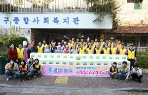 울산나눔회(회장 최시훈)는 지난 22일 울산 남구 종합사회복지관에서 청소년과 함께 하는 사랑의 김장나누기 행사를 갖고 김치 7㎏ 150박스를 울산지역 사회복지시설에 전달했다. 행사에 참가한 최시훈 울산나눔회 회장과 최일학 초대회장, 회원, 울주군 남창중학교 봉사단이 기념촬영하고 있다. 김동수기자 dskim@ksilbo.co.kr