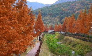 25일 울산 울주군 청량읍 율리 영해마을에 조성된 메타세쿼이아 가로수길이 붉게 물들어 늦가을 정취를 자아내고 있다. 김동수기자 dskim@ksilbo.co.kr