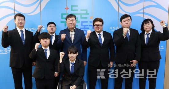 ▲ 울산 동구 돌고래역도단이 27일 동구청장실에서 제45회 전국장애인체육대회 출정식을 갖고 김종훈 동구청장과 기념촬영을 하고 있다.울산 동구 돌고래역도단이 27일 동구청장실에서 제45회 전국장애인체육대회 출정식을 갖고 김종훈 동구청장과 기념촬영을 하고 있다.