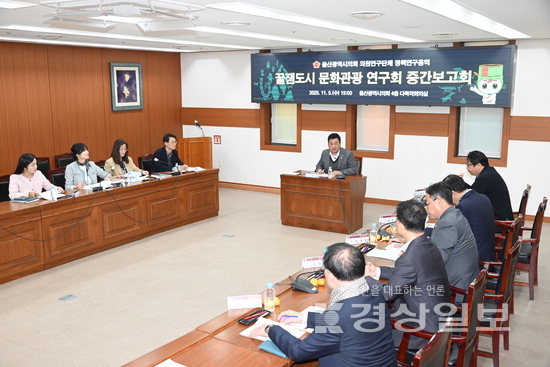 울산시의회 의원연구단체 꿀잼도시 문화관광 연구회(회장 안대룡)는 5일 시의회 4층 다목적회의실에서 ‘꿀잼도시 이미지 정착을 위한 울산형 생태관광 활성화 방안 연구’ 정책연구용역 중간보고회를 개최했다.