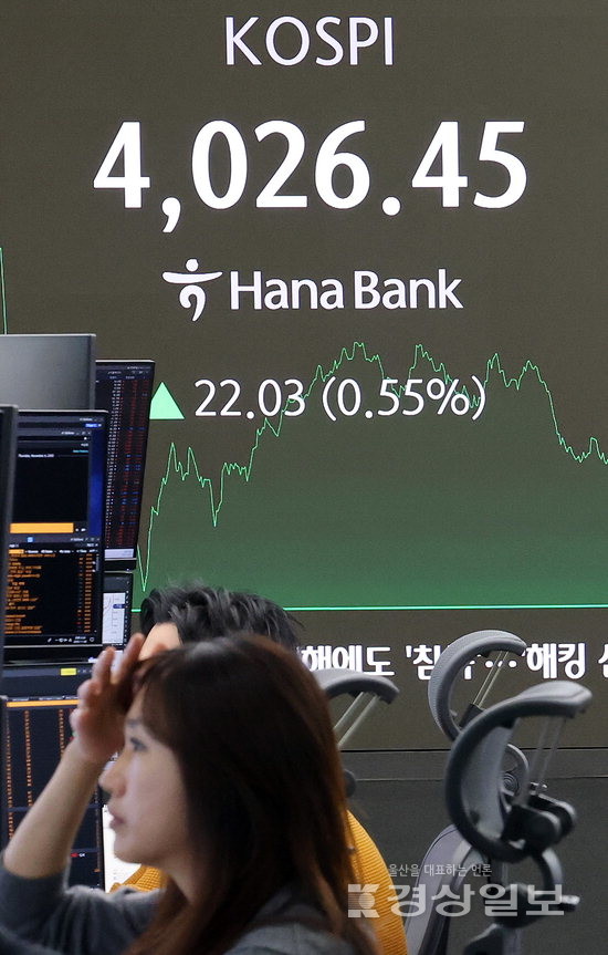 6일 서울 중구 하나은행 본점 딜링룸에서 딜러가 업무를 보고 있다. 이날 코스피지수는 전장보다 22.03p(0.55%) 오른 4026.45에, 코스닥지수는 3.72p(0.41%) 하락한 898.17에 장을 마감했다. 연합뉴스