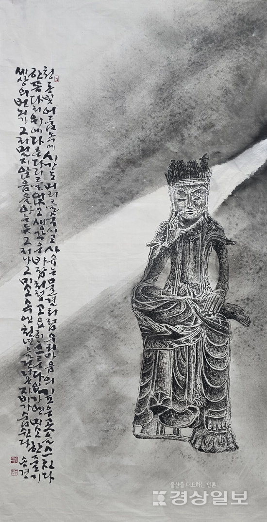 작품 ‘반가사유상(半跏思惟像)’은 금동반가사유상을 염두에 두고 그린 듯하다. 반가사유상은 인간의 본질과 깨달음을 사유하는 상징적 존재로, 많은 예술가와 시인들이 그 깊은 내면의 고뇌와 성찰을 이미지로 표현해 왔다. 좌측 화제는 “청동빛 어둠 속에 시간도 머리를 숙이고, 사유는 물결처럼 우리 마음의 깊은 곳을 스친다. 한쪽 다리 위에 다른 다리를 얹고 생각은 바람처럼 고요히 흐른다. 입가엔 미소 한 줄기, 세상의 번뇌가 그리 멀지 않음을 아는 듯, 그러나 그 미소속엔 천년을 건너온 자비가 숨 쉰다.”라고 적혀 있다. 작가는 반가사유상의 미소 짓는 얼굴을 강조하기 빛이 들어오는 느낌을 수묵으로 온화한 미소를 강조하고 있다. 화가는 세상을 보는 탁월한 시선이 필요하다. 그림에서 중요한 것은 형태 너머 심상(心象)을 담아내는데 있다.