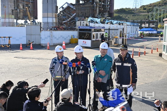 10일 한국동서발전 울산화력발전소 보일러 타워 붕괴 현장에서 열린 중앙사고수습본부 브리핑에서 오영민(왼쪽 두번째) 고용노동부 안전보건감독국장이 취재진 질문에 답하고 있다. 김도현기자 do@ksilbo.co.kr