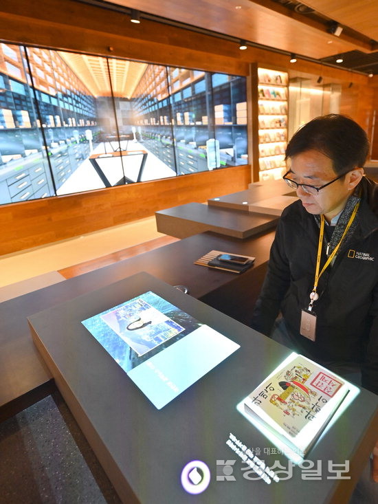 실제 기자가 허준의 동의보감 콘텐츠를 선택해 한자로 적힌 부분을 손으로 누르니 한글로 번역돼 나왔다. 또 사람의 신체기관 중 오장육부를 그려 놓은 곳의 한 부분을 터치하자 증강현실(AR)처럼 입체적으로 튀어나와 재미를 더했다. 실감서재와 연동된 스마트 책장을 활용해 직관적인 도서 탐색도 가능하다. ‘AI 사서’를 통해 개인 맞춤형 도서를 추천받을 수 있으며, 독서 초심자의 다양한 궁금증도 해소할 수 있다. 이용자는 체험한 모든 정보를 QR코드로 저장할 수도 있다. 국립중앙도서관은 2021년부터 이런 도서관 특화 실감 콘텐츠 서비스를 제공해왔다.