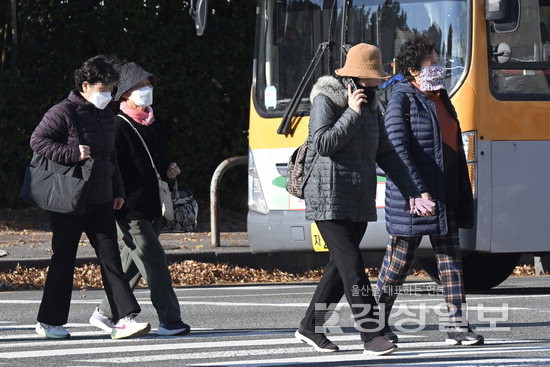18일 울산 북구 매곡동과 울주군 삼동면 지역에 올해 가을 들어 처음으로 영하의 날씨를 기록하는 등 한파가 몰아쳤다. 거리를 지나는 시민들이 몸을 잔뜩 움츠린 채 걸음을 옮기고 있다. 김동수기자 dskim@ksilbo.co.kr