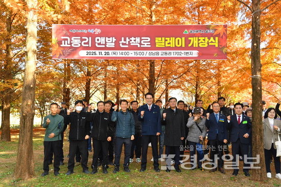 ▲ 울산 울주군이 20일 삼남읍 교동리 일원에서 이순걸 울주군수와 시군의원, 관계 공무원, 삼남읍 이장단과 지역주민 등 100여명이 참석한 가운데 맨발 산책로 릴레이 개장식을 개최했다. 울주군청 제공울산 울주군이 20일 삼남읍 교동리 일원에서 이순걸 울주군수와 시군의원, 관계 공무원, 삼남읍 이장단과 지역주민 등 100여명이 참석한 가운데 맨발 산책로 릴레이 개장식을 개최했다. 울주군청 제공 기자명 다른기사 보기 저작권자 © 경상일보 무단전재 및 재배포 금지 개의 댓글 회원로그인 작성자 비밀번호 댓글 내용입력 댓글 정렬 최신순 추천순 답글순 BEST댓글 BEST 댓글 답글과 추천수를 합산하여 자동으로 노출됩니다. 닫기 더보기 댓글삭제 삭제한 댓글은 다시 복구할 수 없습니다. 그래도 삭제하시겠습니까? 비밀번호 닫기 댓글수정 댓글 수정은 작성 후 1분내에만 가능합니다. 본문 / 400 비밀번호 닫기 내 댓글 모음 닫기
