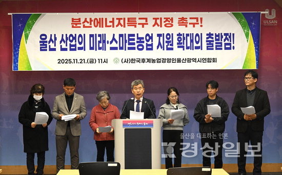 한국후계농업인경영회울산광역시연합회는 지난 21일 울산시청 프레스센터에서 기자회견을 열어 정부의 분산에너지 특구 지정 보류 철회 및 연내 지정을 촉구했다. 김경우기자 woo@ksilbo.co.kr