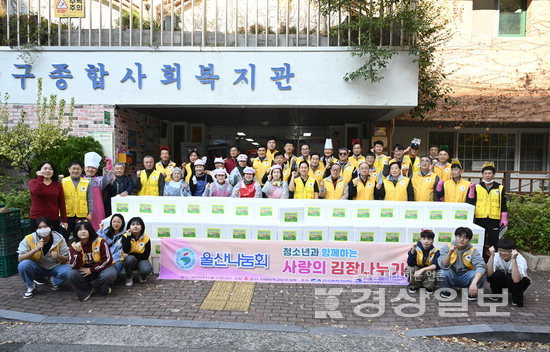 울산나눔회(회장 최시훈)는 지난 22일 울산 남구 종합사회복지관에서 청소년과 함께 하는 사랑의 김장나누기 행사를 갖고 김치 7㎏ 150박스를 울산지역 사회복지시설에 전달했다. 행사에 참가한 최시훈 울산나눔회 회장과 최일학 초대회장, 회원, 울주군 남창중학교 봉사단이 기념촬영하고 있다. 김동수기자 dskim@ksilbo.co.kr