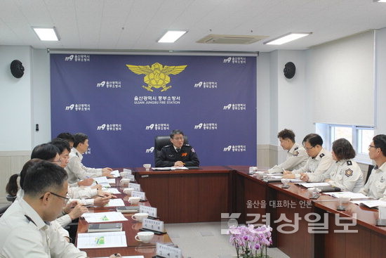 ▲ 홍장표 울산소방본부장은 24일 울산중부소방서(서장 유대선)를 초도 방문, 현안 업무보고를 받고 건의사항을 청취한 뒤 일선 현장 직원들을 격려했다.홍장표 울산소방본부장은 24일 울산중부소방서(서장 유대선)를 초도 방문, 현안 업무보고를 받고 건의사항을 청취한 뒤 일선 현장 직원들을 격려했다.