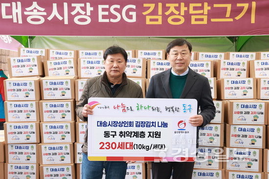 ▲ 울산 동구 대송시장 상인회(회장 이윤형)는 25일 대송시장 일원에서 상인들과 자원봉사자 등 30여명이 참여한 가운데 1000만원 상당의 김치를 담가 관내 취약계층 230가구에 전달했다.울산 동구 대송시장 상인회(회장 이윤형)는 25일 대송시장 일원에서 상인들과 자원봉사자 등 30여명이 참여한 가운데 1000만원 상당의 김치를 담가 관내 취약계층 230가구에 전달했다.
