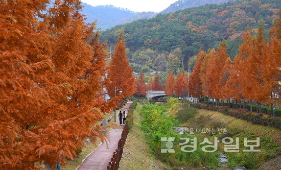 25일 울산 울주군 청량읍 율리 영해마을에 조성된 메타세쿼이아 가로수길이 붉게 물들어 늦가을 정취를 자아내고 있다. 김동수기자 dskim@ksilbo.co.kr