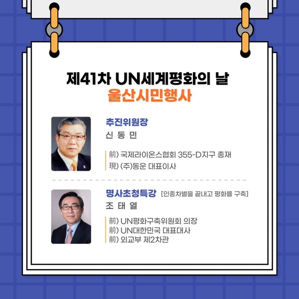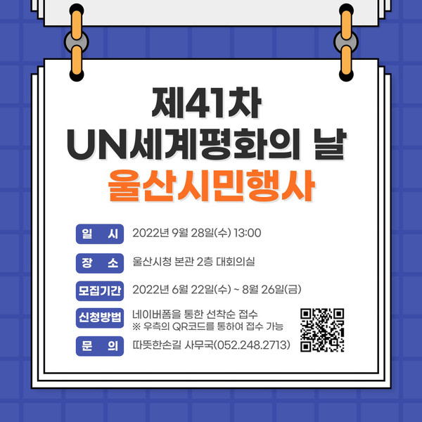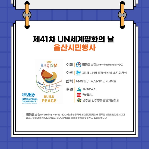 울산지역 NGO 단체인 따뜻한손길(Warming Hands NGO)은 '제41차 UN세계평화의 날 울산시민행사'가 오는 9월 28일(수) 울산시청 본관에서 개최된다고 밝혔다.